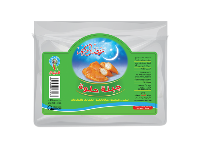 الوزن 250 غم نسبة الدسم (20 %).جبنة بيضاء غير مملحة معبأة بأكياس نايلون مفرغه من الهواء. تحفظ مبردة على درجة حرارة أقل من (4 م ) .