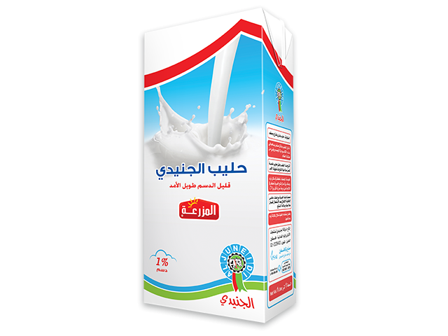 السعة :- 1 لتر ، نسبة الدهون (1%) . حليب تم إنتاجه في مزارع شركة الجنيدي للأبقار الحلوب وفق أحدث الطرق . تم تعقيمه بتكنولوجية تتراباك الحديثة (UHT) وتعبئته في عبوات كرتون تتراباك محكمة الإغلاق العصرية وسهلة التداول, تصل مدة صلاحيته لستة شهور .